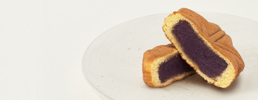 沖縄県産の紅芋を使用し、コクのある甘さと紫色の鮮やかな色合いが特徴のもみじ饅頭。