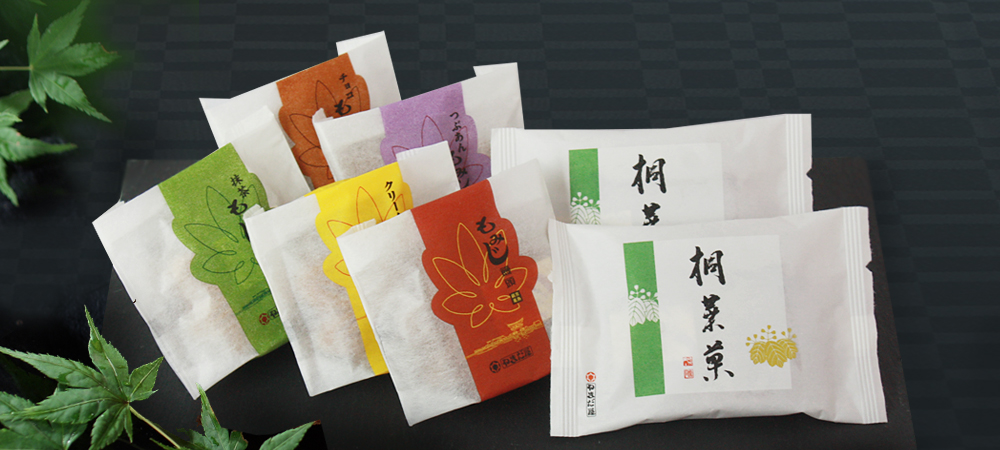 もみじファミリーに、もちもち食感が人気の桐葉菓(とうようか)を加えた詰め合せです。